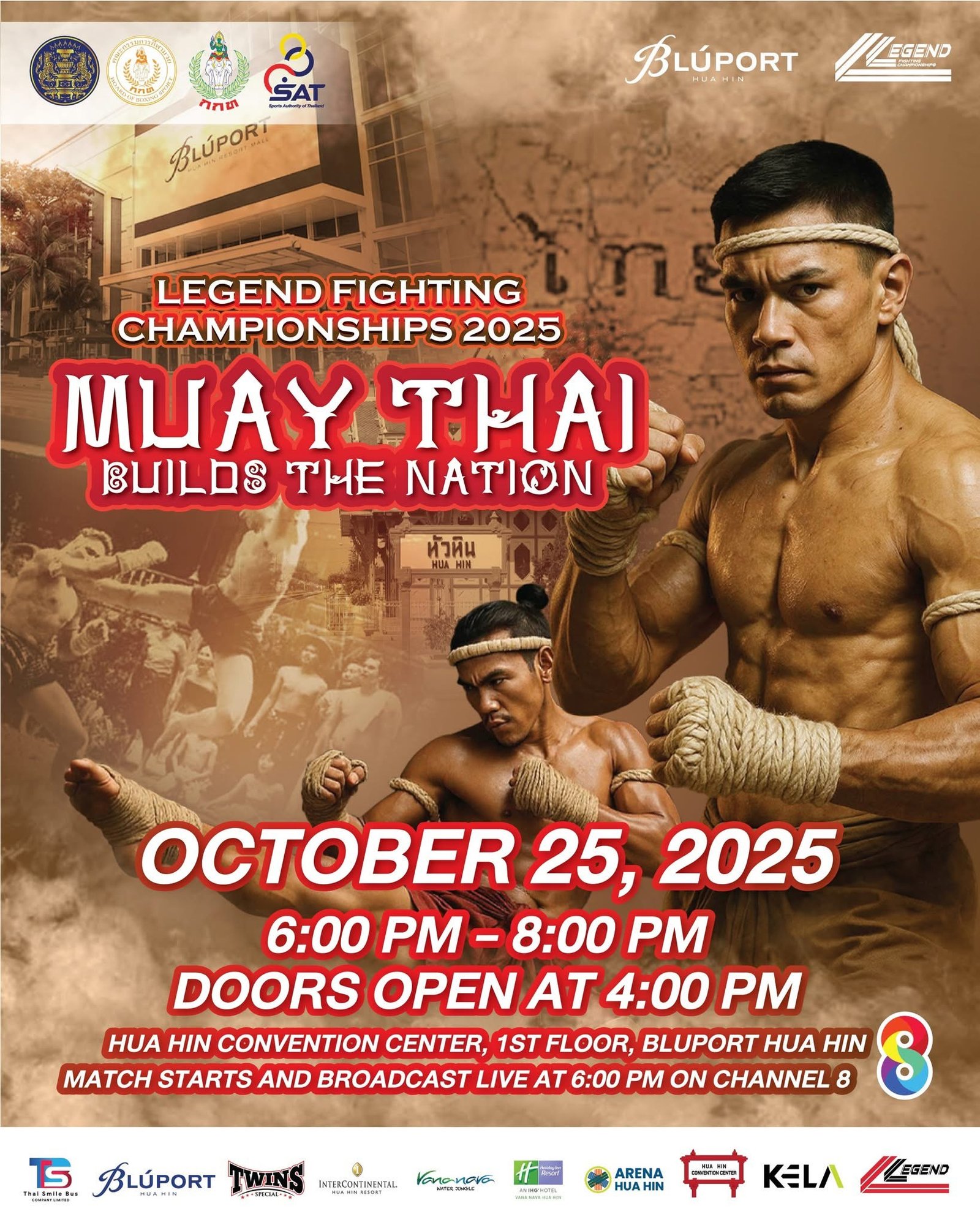 🔥 The Ultimate October Showdown! 🔥 Legend Fighting Championships 2025 – "Muay Thai for the Nation" Get ready for an explosive night of combat! The battle for the prestigious championship trophy returns — and no Muay Thai fan should miss it! 🇹🇭🥊 When 🇹🇭 Team Thailand takes on 🌏 International Fighters A battle of pride — who will claim the crown? 🏆 📅 Saturday, October 25, 2025 ⏰ Starts at 6:00 PM 📍 Hua Hin Convention Center, 1st Floor, Bluport Hua Hin, Prachuap Khiri Khan 🥊 Thrilling matchups in both Traditional Rope-Tied Muay Thai and Modern Glove Muay Thai Featuring top fighters from Thailand, Iran, Myanmar, Morocco, Brazil, Uzbekistan, and more! Every bout is a banger — every round is war! 🔥 Fight Card – 7 Action-Packed Bouts Bout 1 (56.7 kg) 🇲🇦 Akram Ouchibi (Morocco) 🆚 🇹🇭 Phetsairung S. Ded-Damrong (Thailand) Bout 2 (60 kg) 🇧🇷 Carlos Douglas Santos Costa (Brazil) 🆚 🇹🇭 Sakadphet P. Praphatlukphothor (Thailand) Bout 3 – Women’s Match (53 kg) 🇮🇷 Negin Afshin Shahinfar (Iran) 🆚 🇹🇭 Kanokwan – Nongtokpaen Sports Center (Thailand) Bout 4 (58 kg) 🇲🇦 Akdahe Boujamaa (Morocco) 🆚 🇹🇭 Montu – Luk Nong Saeng (Thailand) Bout 5 (59 kg) 🇲🇲 Saw Ae Shee (Myanmar) 🆚 🇹🇭 Udomlek Nu Pranburi (Thailand) Bout 6 (63.5 kg) 🇺🇿 Shokhzod Zafar Ugli Azamatov (Uzbekistan) 🆚 🇹🇭 Ratchanon Ekmuangnon (Thailand) Bout 7 (64 kg) 🇲🇦 Younes Rhali (Morocco) 🆚 🇹🇭 Wanmeechai Luk Nong Saeng (Thailand) 🎥 Live broadcast on Channel 8 (No. 27 nationwide) 💻 Watch live on Facebook / YouTube: LFC Legend Fighting Championships The powerhouse event "Muay Thai for the Nation" is back to ignite the arena with intensity! Let’s rally behind our Thai fighters and cheer them on to victory!
